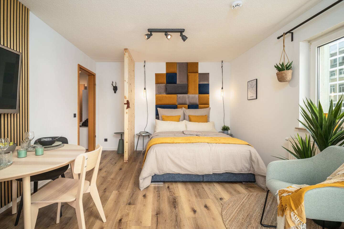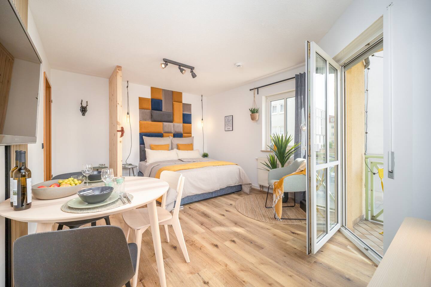 Welcome to our stylish studio apartment in Dresden! Perfect for couples or solo travelers, our modern retreat offers comfort and convenience. Inside, you'll find a cozy queen-sized bed, a fully-equipped kitchen with a stove, refrigerator, dishwasher, and washer with dryer. Relax on the small balcony with views of Neptunbrunnen and a nearby café. Conveniently located near Bahnhof Mitte, explore Dresden's attractions with ease. Enjoy free street parking and a relaxing stay in the city!
