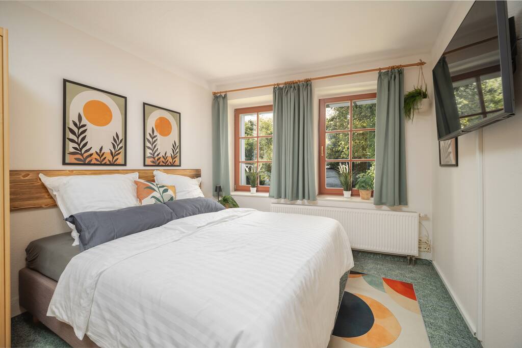🛏️ What You’ll Find in This Flat: – Comfortable king-sized box spring bed (180x200 cm) – Extra-long duvets (2 x 150x220 cm) – Small kitchenette with stove, fridge, etc. – Nice Garden View – Bathroom with standing shower, toilet – WiFi and TV – Thoughtful design with a homely touch ☕ Additional Amenities in the House: – Nespresso coffee machine in the common area – Books and travel guides about Freiberg – Iron and drying rack (on request) – Hammock for the garden (on request) – Shared washing machine (on request) – Baby cot and high chair (on request) 🌳 Shared Outdoor Spaces: Guests have access to a lovely shared garden, perfect for enjoying a quiet moment with a book or a morning coffee. A shared parking area is also available, making your stay even more convenient.