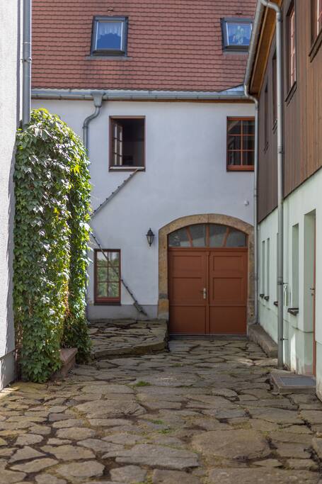 We are delighted to offer you a stay at our newly renovated flats in the historic Altstadt of Freiberg. The building combines original charm with updated amenities. The apartments are set back from the street for a quieter stay and include access to a shared garden. They are suitable for both individuals and groups of friends who want to stay in the same house. This flat (#8) includes a queen-size bed, a work station, a sofa, a small kitchen and everything needed for a comfortable stay.